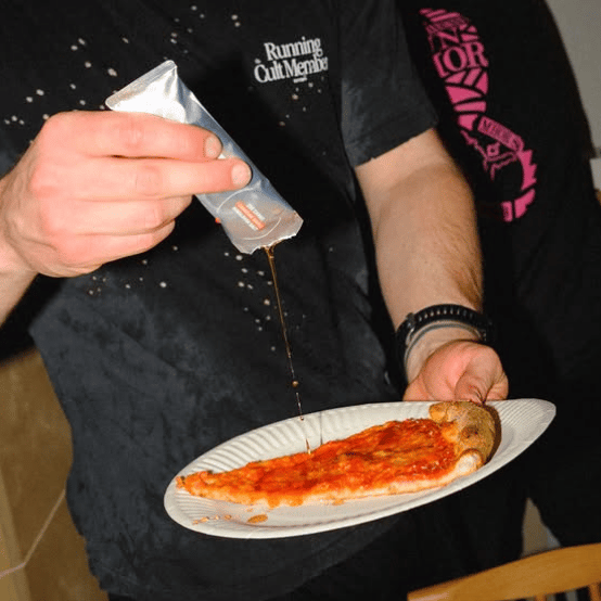 It functions as a standard on-the-go gel. But the format also allows it to be poured — over pizza, pancakes, oats, rice cakes.
