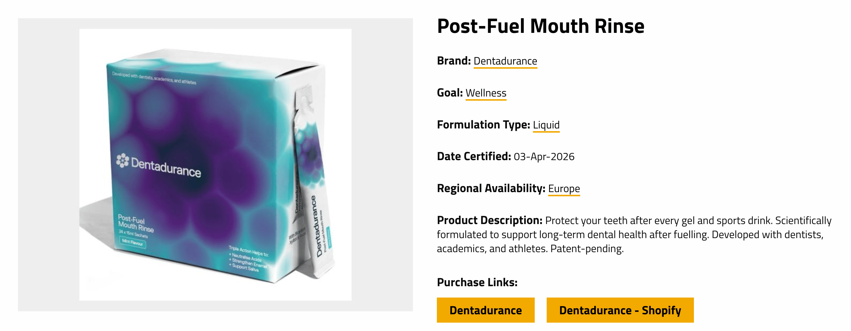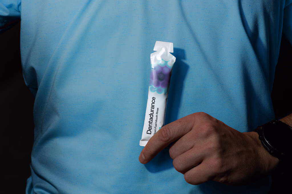 Their answer is a post-fuel mouth rinse. A single-use sachet, used as a 30-second rinse-and-spit after every fuel. According to Dentadurance, it helps neutralise acids, disrupt plaque, and strengthen enamel — designed to sit between the morning and evening brushing windows, not replace them.